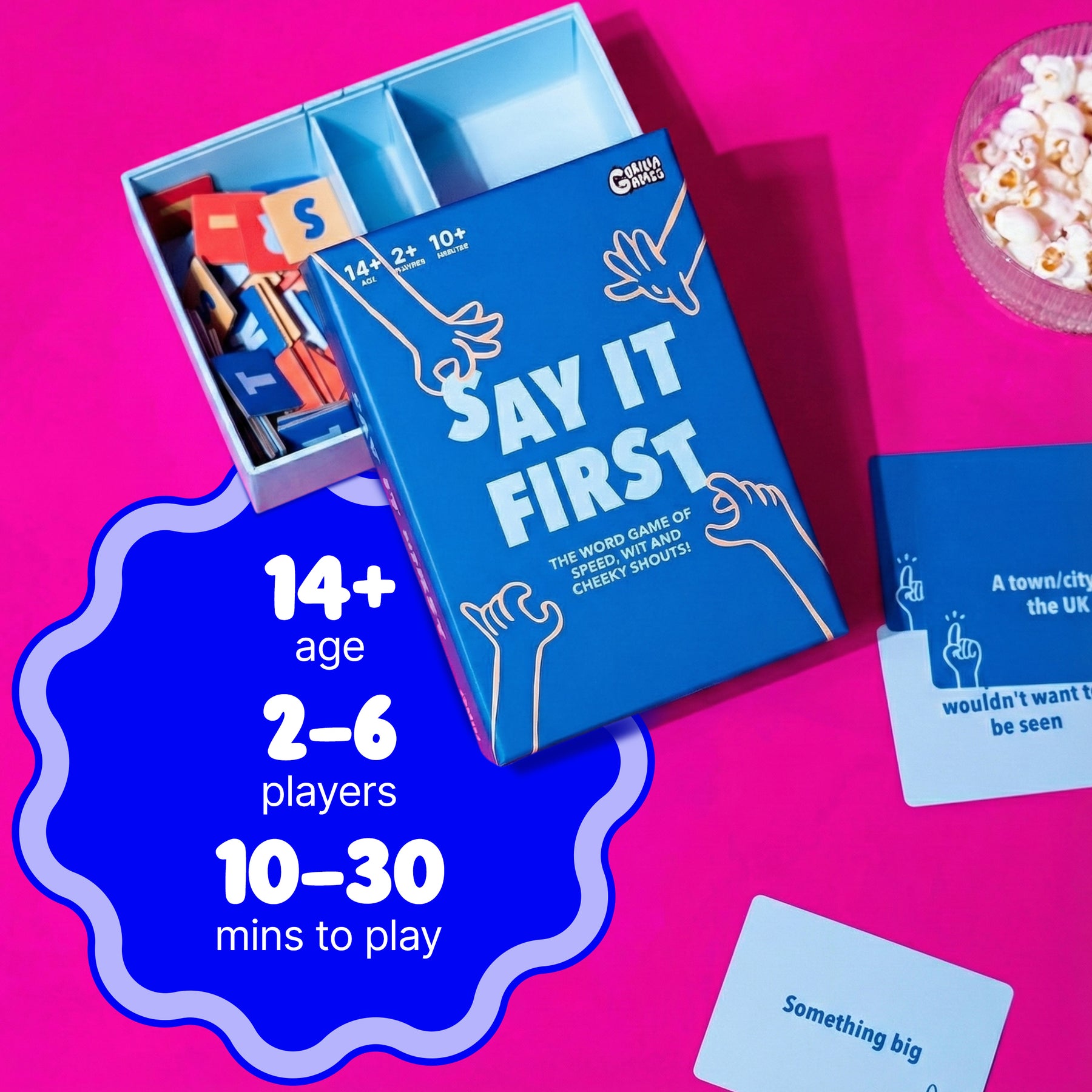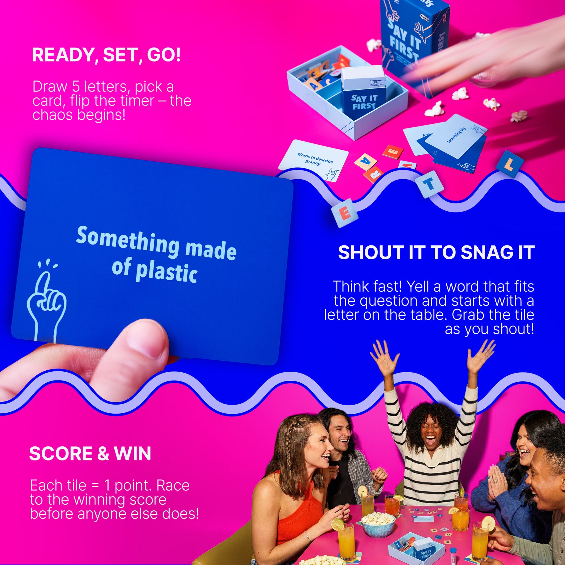 - All players now try to come up with words that start with one of the letters on the table and match the question. Grab the tile as you shout out your word!