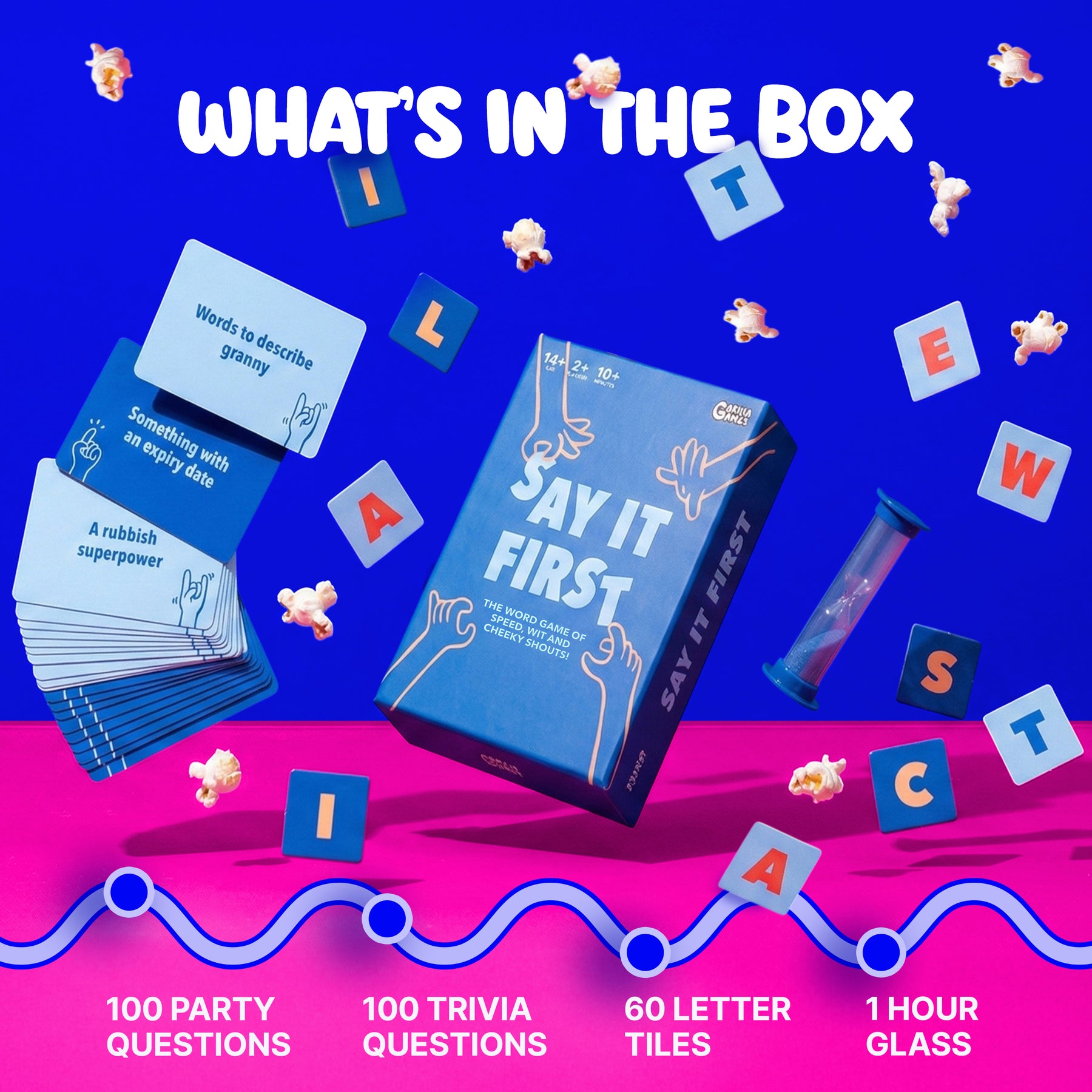 Be the first to come up with a word that matches both the letter tiles on the table and the question being read aloud to score points. Choose between 100 trivia and 100 party questions, flip the hourglass, and let the game begin!